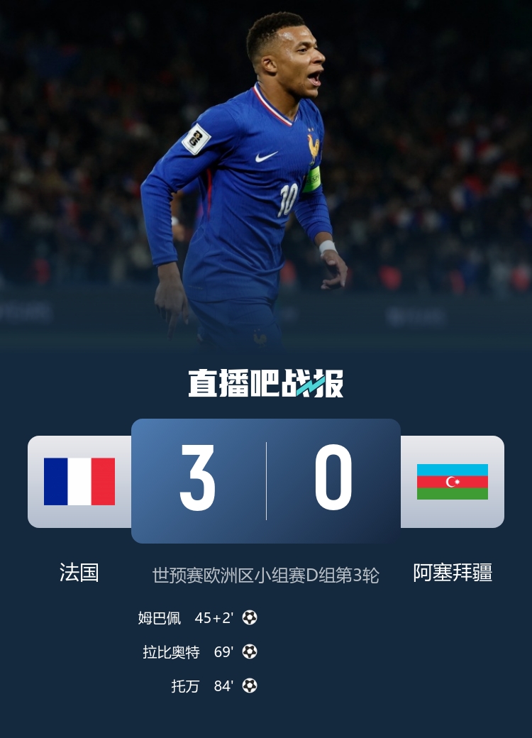 法国队3-0打败阿塞拜疆,自2022年3月25日对阵科特迪瓦以来,法国队初次在一场比赛中莫得任何别称巴黎圣日耳曼球员出场,界限了流畅46场国度队比赛中王人有巴黎球员参赛的记录。