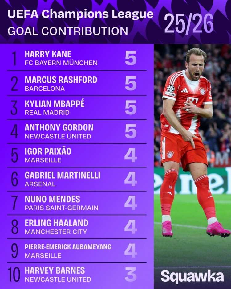 10月23日讯 本赛季欧冠联赛阶段已战罢3轮,Squawka统计了到当今截止的参与进球榜,拜仁前卫凯恩、巴萨报复手拉什福德、皇马的姆巴佩以及纽卡边锋安东尼-戈登均参与5球。