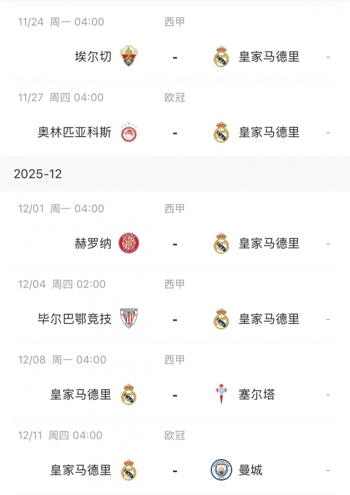 皇马将在海外比赛日放胆后迎来伙同四个客场,以及将迎来与曼城的欧冠比赛,记者Picon以为,这是对阿隆索的一次大考,他写谈:“伙同三个客场征程,包括对阵本赛季黑马埃尔切与毕尔巴鄂竞技。而辽远巨兽隐现:与曼城的对决,将成为考验这支球队是否具备抗衡欧洲顶级豪强实力的又一次大考——本赛季他们已两度失利。”