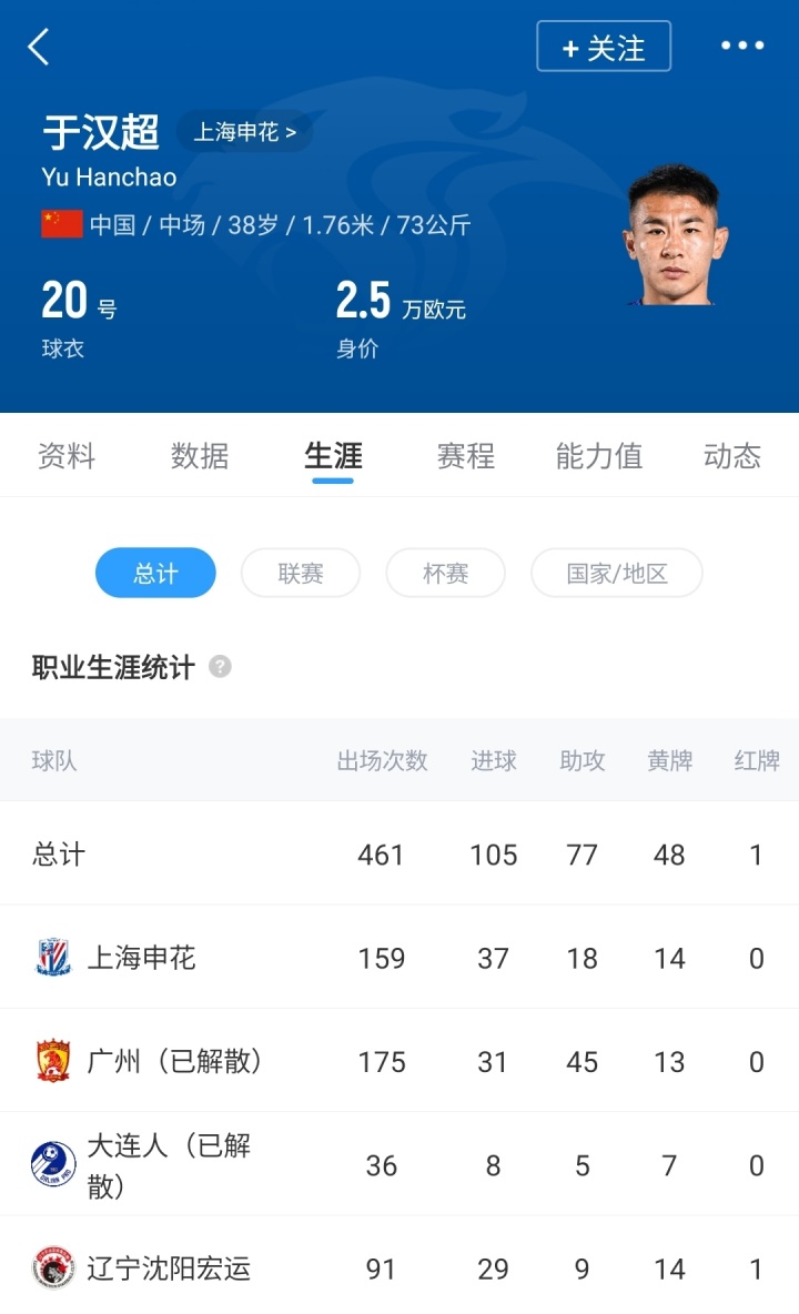 本赛季38岁的于汉超代表申花出战26场比赛,孝敬9球3助。