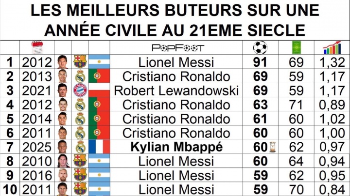 12月份皇马还剩下5场比赛可踢,姆巴佩有契机冲击C罗和莱万的年度69球,梅西在2012年的91球依旧难以企及。