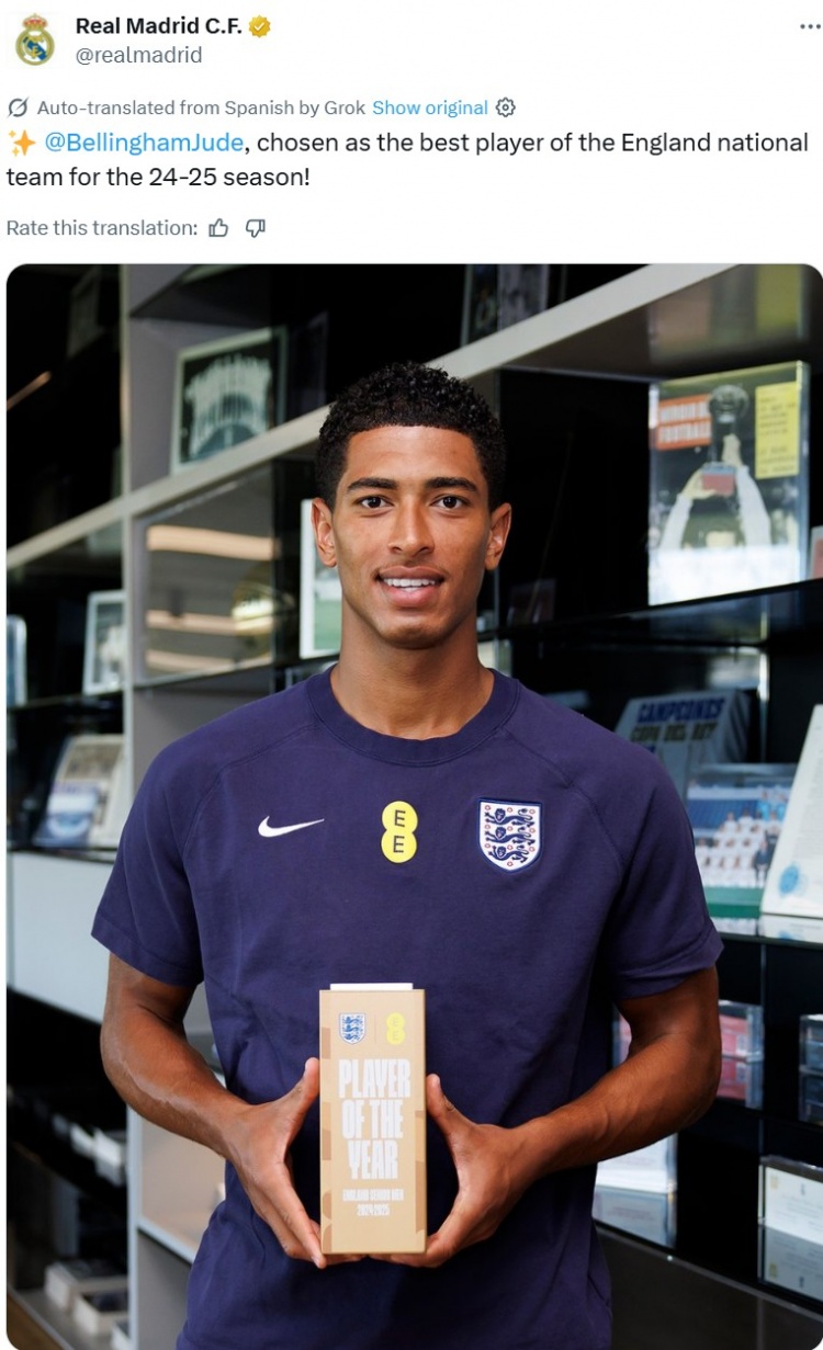 10月2日讯 贝林厄姆当选24/25赛季英格兰男人成年队年度最好球员,皇马官推也晒照为其奉上道贺。