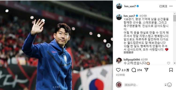 孙兴慜在酬酢媒体上写谈:“138场比赛,诚意感谢与我共同创造牢记时辰的球员、职责主谈主员,以及球迷们,感谢你们让我已毕儿时的梦念念,我感到特殊骄横和幸福。 ”