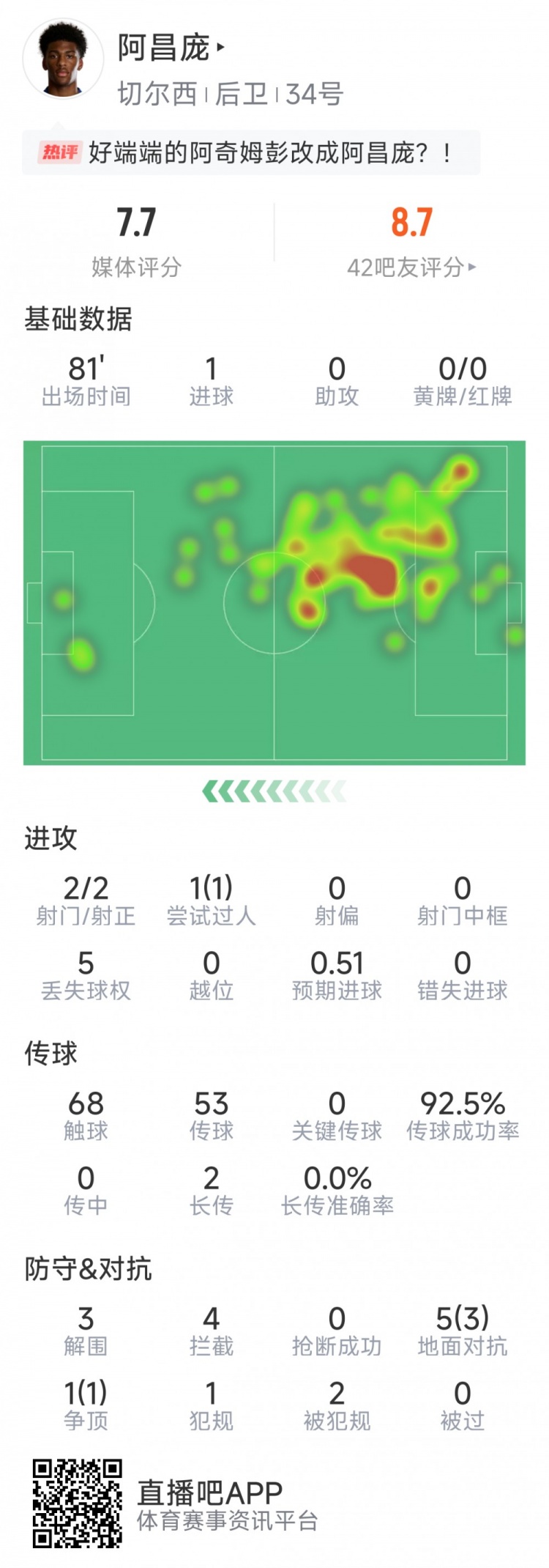 10月18日讯 在本轮英超切尔西对阵诺丁汉丛林的比赛中,阿昌庞打进蓝军糊口处子球。以下为他在本场数据:
