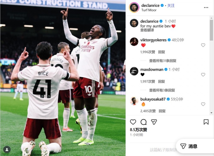 赖斯的姨妈贝芙近日厌世,阿森纳中场用进球献给了我方宠爱的东谈主。