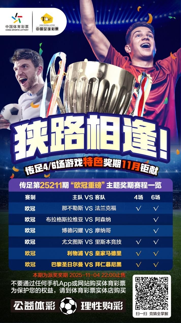 传足4/6场游戏特点奖期第25211期依然于2025年11月2日20:00开售,将于2025年11月4日22:00停售,并于11月5日开奖,其中那不勒斯VS法兰克福、尤文图斯VS里斯本竞技、利物浦VS皇家马德里和巴黎圣日尔曼VS拜仁慕尼黑为4场进球游戏竞猜赛事。