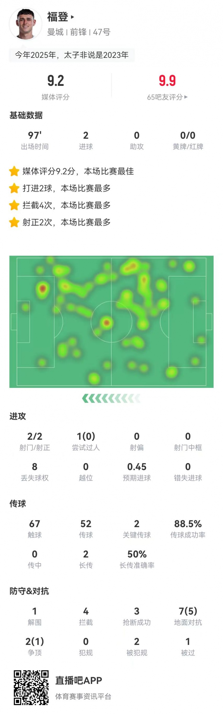 12月3日讯 曼城在本轮英超对阵富勒姆,福登本场数据如下: