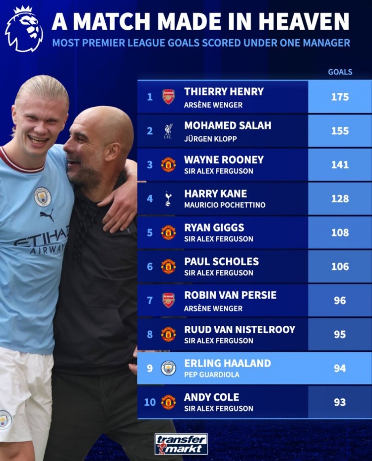 9、哈兰德(曼城,主帅瓜迪奥拉):94球