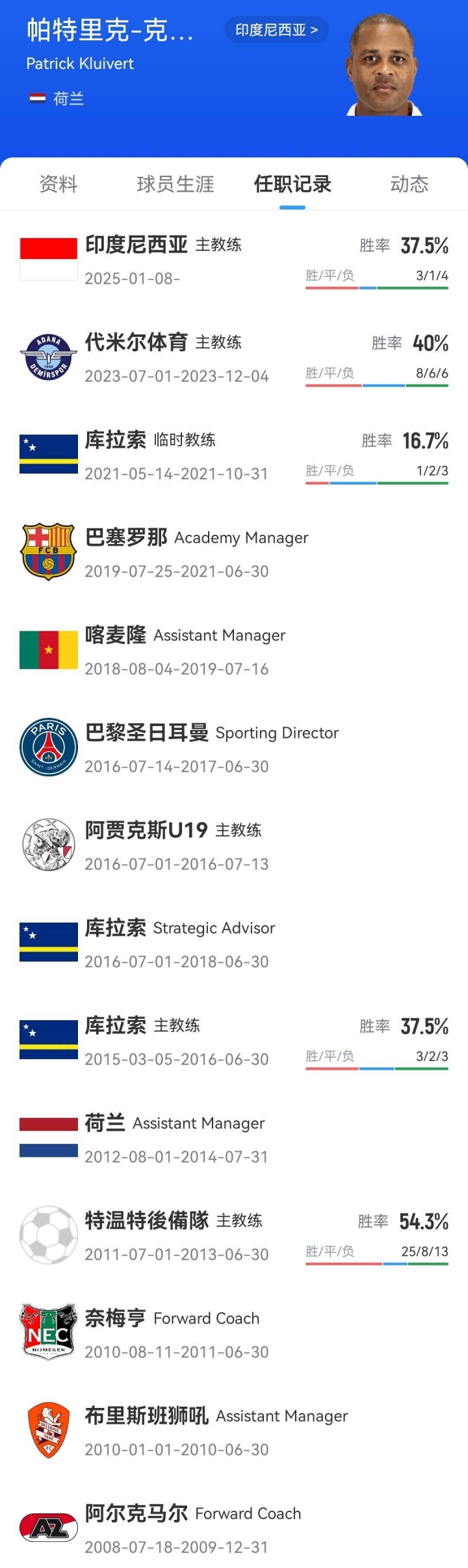克鲁伊维特现年49岁,球员时期他是足坛最优秀的弓手之一,曾遵循阿贾克斯、AC米兰、巴萨等队,退役后曾担任喀麦隆助教、库拉索代理主帅。他抓教印尼前独逐个段雅致主帅阅历是2023年7月起担任土超代米尔体育主帅,20场比赛8胜6平6负,抓教5个月便下课。克鲁伊维特还担任过荷兰国度队主帅范加尔的助教,匡助球队在2014年巴西寰球杯取得季军。
