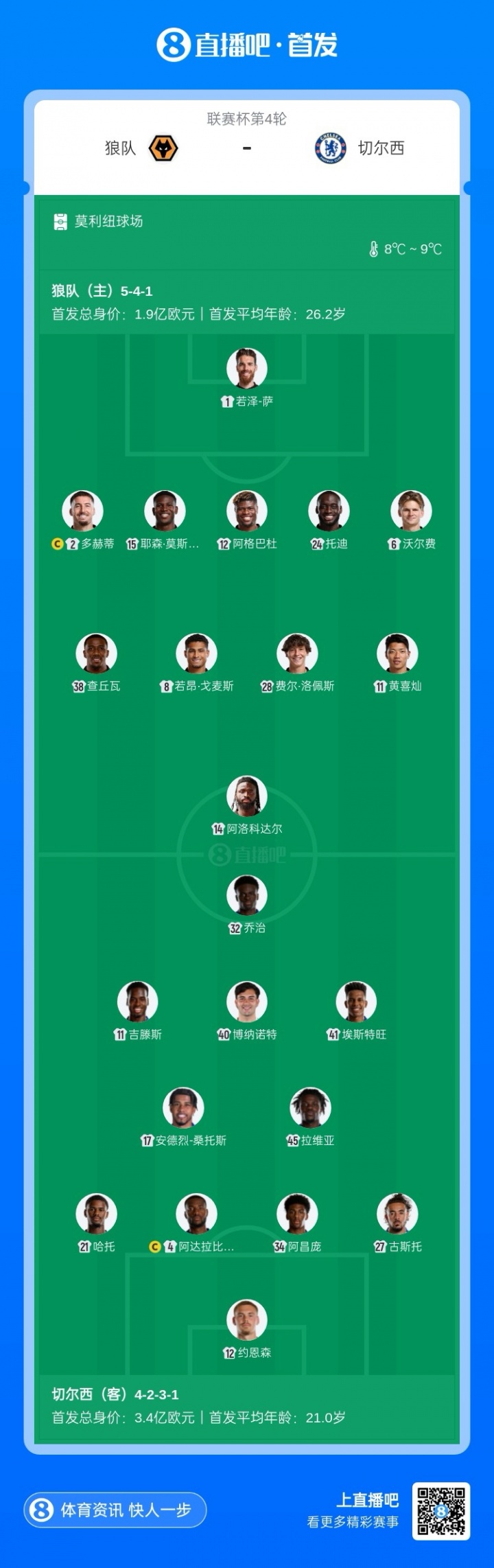 狼队首发:1-若泽-萨、2-多赫蒂、6-沃尔费、12-阿格巴杜、15-耶森·莫斯克拉、24-托迪、8-若昂·戈麦斯、11-黄喜灿、28-费尔·洛佩斯、38-查丘瓦、14-阿洛科达尔