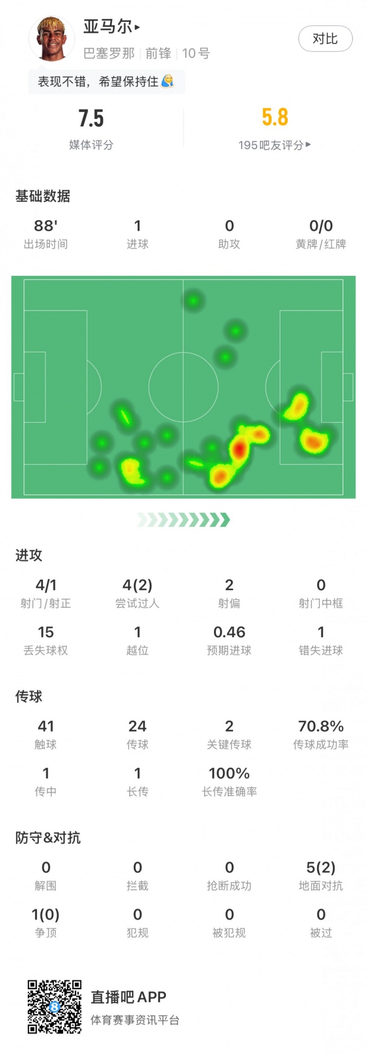 11月3日讯 西甲第11轮巴萨主场对阵埃尔切,亚马尔此役代表巴萨首发出战,在第88分钟被替换下场,有1个进球,球员此役数据如下: