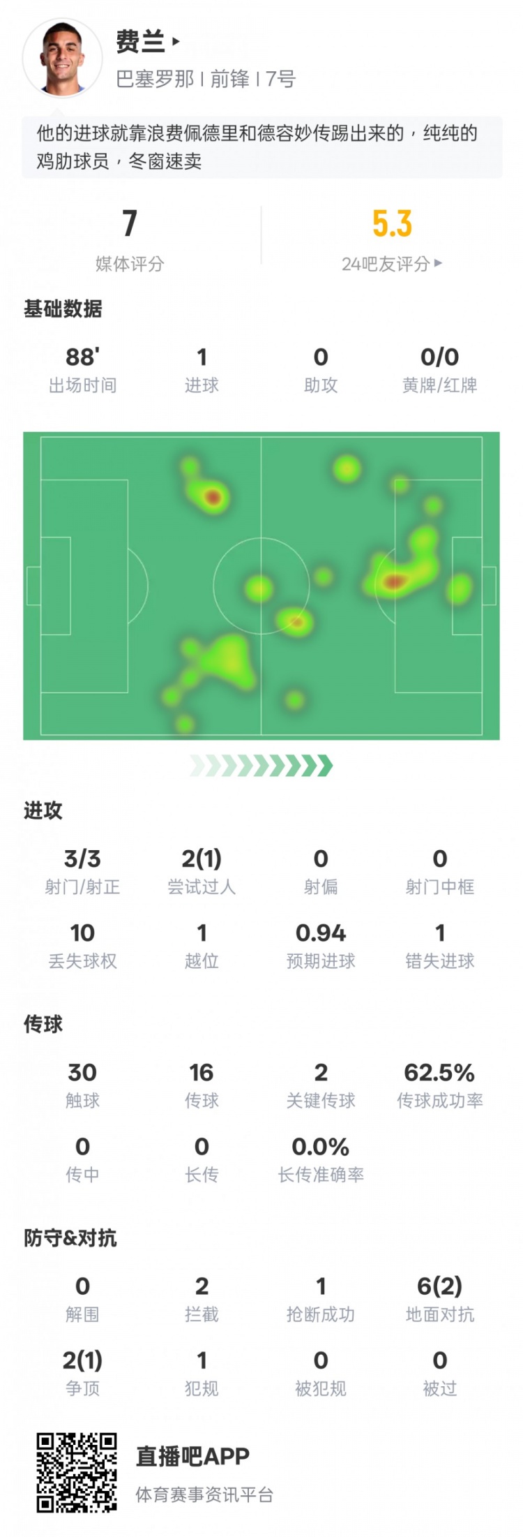11月3日讯 西甲第11轮,巴萨主场迎战埃尔切,费兰-托雷斯首发出战,孝顺1粒进球,送出2次要津传球,1次过东谈主到手,1次错失进球契机,评分7.0。