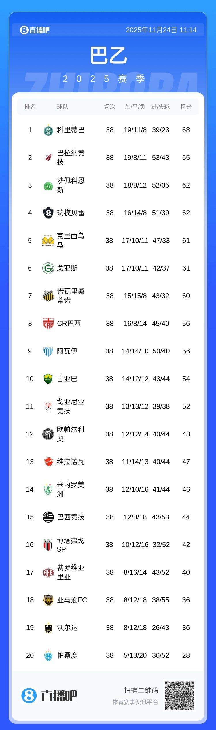 11月24日讯 2025赛季巴乙联赛完了沿途争夺,科里蒂巴等4队升入巴甲。