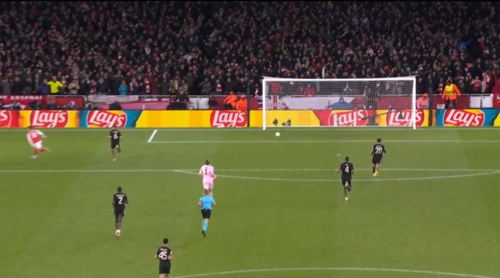 第74分钟,拜仁1-2过时时,阿森纳后场断球发动反击,诺伊尔此时本就站位靠前,已处在接近中圈弧位置。