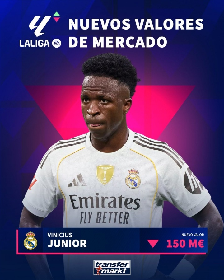 10月02日讯 当天德转更新了西甲球员身价,其中皇马边锋维尼修斯身价下落2000万欧,至1.5亿欧。