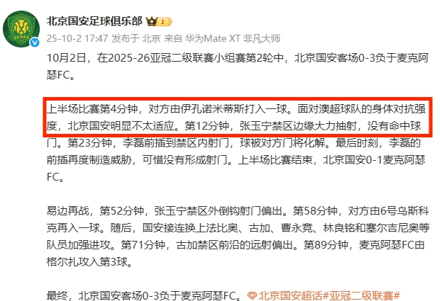 赛后,国安官方发布的战报中对丢球的原因进行了说明:濒临澳超球队的形体挣扎强度,球队昭彰不太顺应。