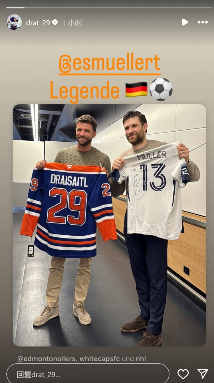 穆勒与德国冰球选手德赖塞特尔交换球衣并合影,后者遵循于NHL埃德蒙顿油东谈主队,亦然司职时尚,两东谈主社媒转发合照,并互称对方为听说。