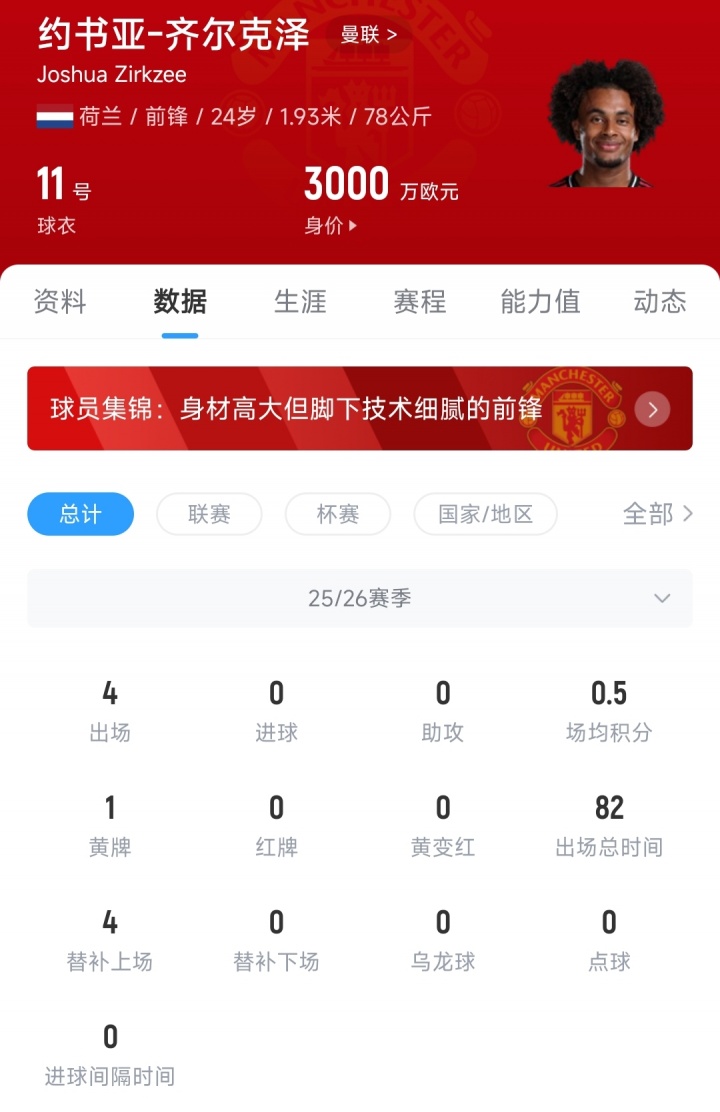 2024年夏窗,时任曼联主帅滕哈赫消耗4250万欧元,从博洛尼亚签下了我方的荷兰老乡王人尔克泽。加盟曼联于今,王人尔克泽共代表球队出战53场比赛,孝敬7粒进球和3次助攻,现在24岁的王人尔克泽德回身价为3000万欧元。