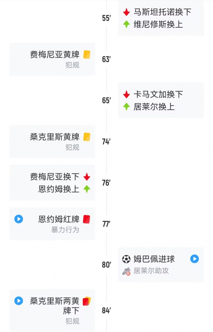 第77分钟,一样是替补登场的恩约姆刚上场1分钟,就因对维尼修斯犯规被主裁直红罚下。