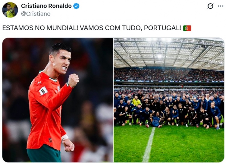 C罗本场因停赛缺席,他在比赛遗弃后也在社媒晒出全队合影,配文写谈:“咱们晋级宇宙杯了!加油,葡萄牙!”