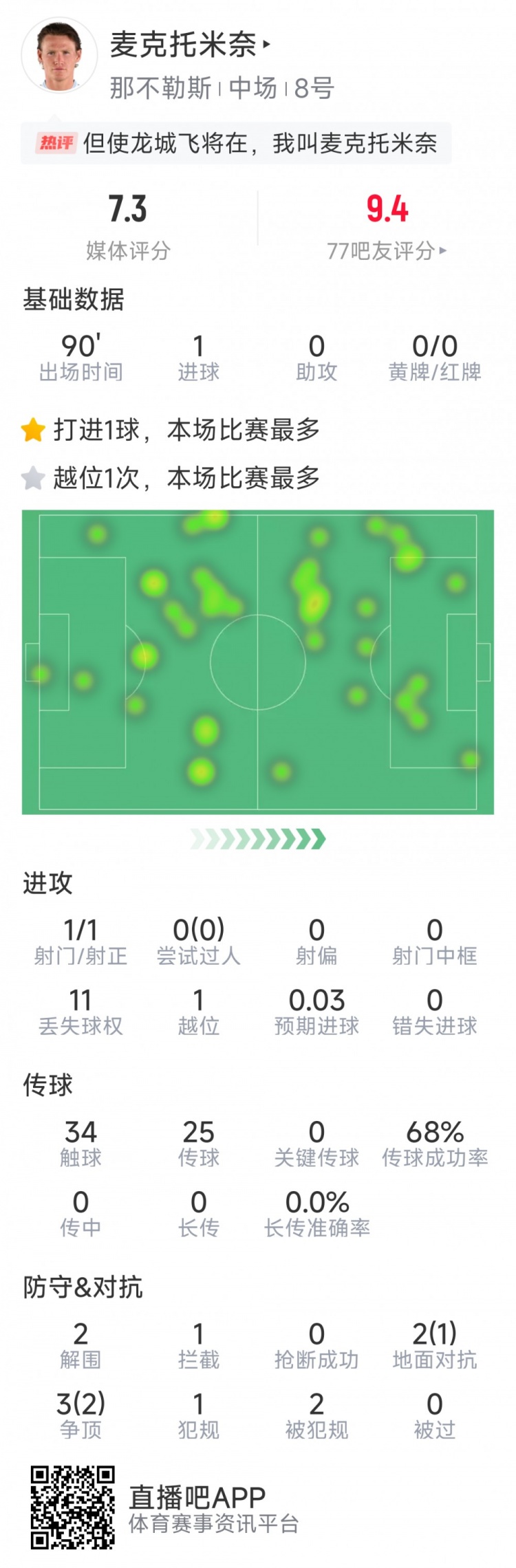 10月26日讯 在本轮意甲,那不勒斯3-1打败国米,以下为麦克托米奈本场数据: