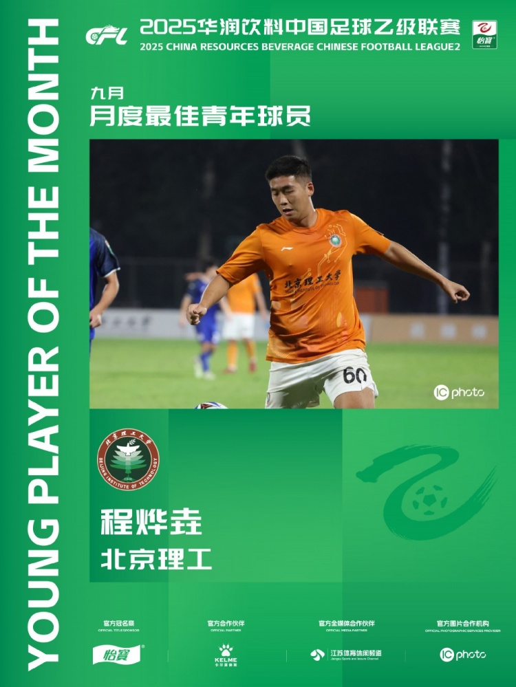 10月31日讯 中乙联赛官方公布了9月最好后生球员,北京理工球员程烨垚当选,他在9月出场4次打入3球并送出2次助攻。