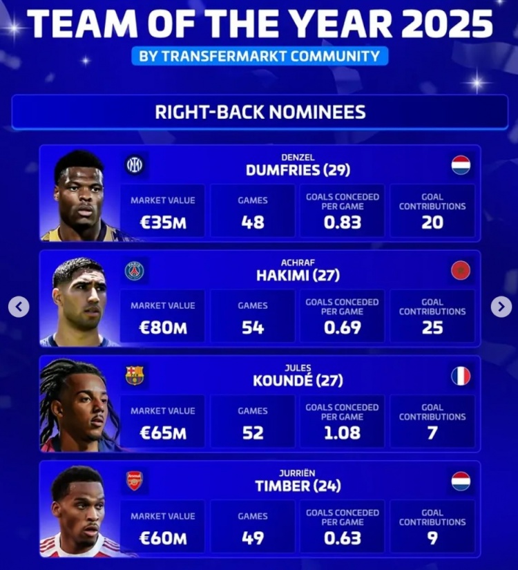 12月3日讯 《转会市集》评比2025年最好右后卫,并排出了4东谈主候选同期对比了他们的数据: